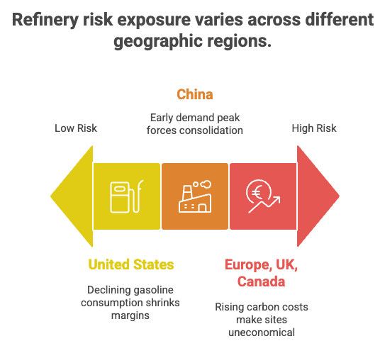 This wave of rationalization and conversion is not evenly distributed. Risk is concentrated in regions where carbon costs are escalating, gasoline demand is eroding, and capital expenditures for decarbonization are intensifying.