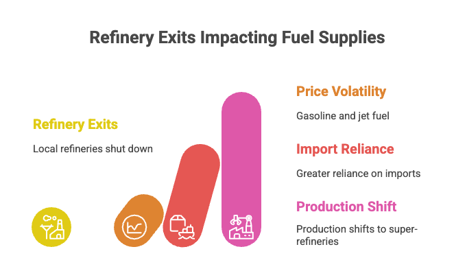 • California: Rapid refinery exits will tighten local gasoline and jet fuel supplies, increasing price volatility and reliance on imports that must comply with stringent CARBOB and LGIR specifications.