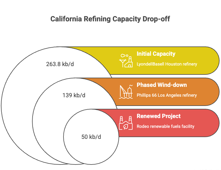 • Phillips 66 Los Angeles (~139 kb/d): Phased wind-down, ceasing operations by Q4 2025, impacting approximately 900 jobs.